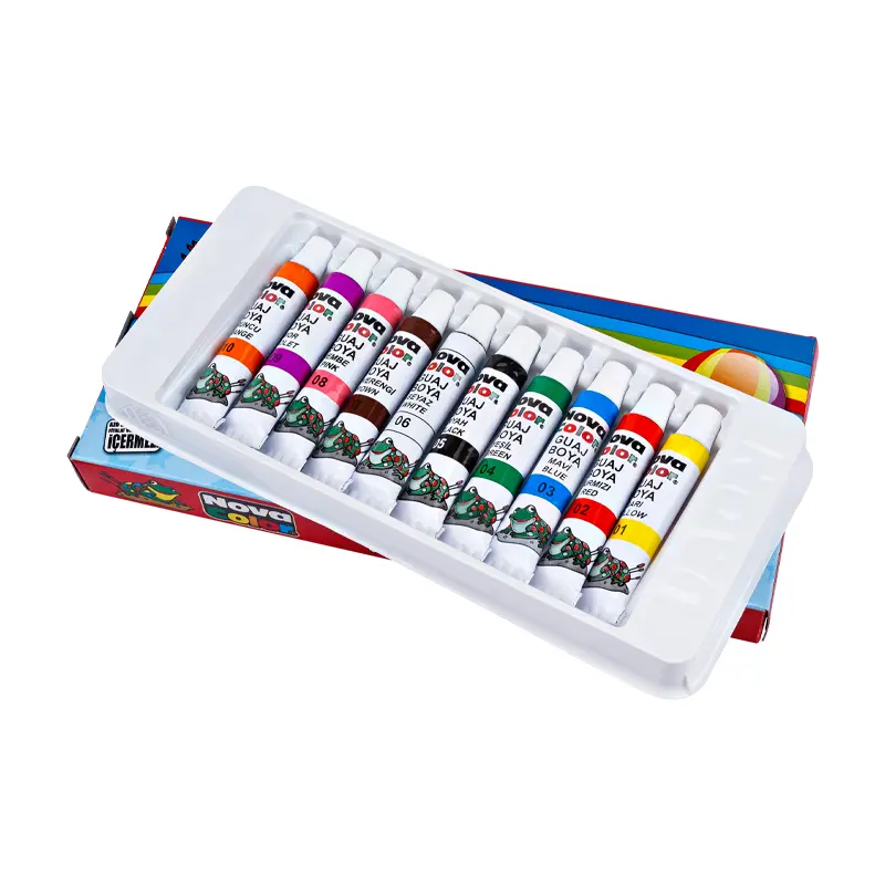 Nova Color Guaj Boya Tüp 10 Renk seti, sanatçılar ve hobi meraklıları için ideal bir seçenektir. Her tüp 7 ml hacminde olup, 10 farklı renk seçeneği sunmaktadır. Bu set, geniş renk yelpazesiyle çeşitli projelerde kullanılabilir.